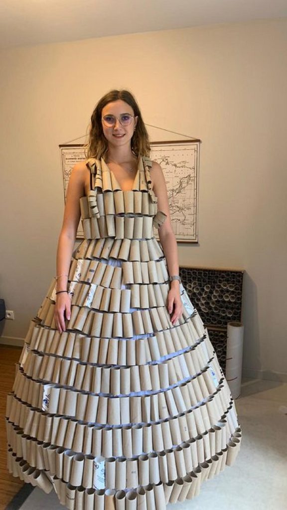 Com o tempo, Agathe não só acumulou peças, como também deu um passo além: decidiu transformar sua coleção em algo criativo. Com a ajuda de uma costureira, confeccionou uma roupa feita inteiramente de rolos. Para isso, foram usados cerca de 400 tubos de papelão. A inspiração veio de uma influenciadora que havia feito um vestido com embalagens de chocolate.