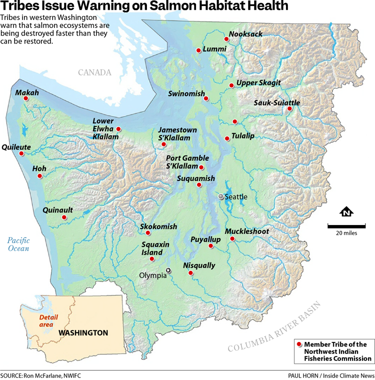 Essas falhas federais e estaduais na proteção dos habitats do salmão estão tornando sem sentido os direitos de pesca dos indígenas no oeste de Washington, alertou um relatório divulgado em fevereiro pela Comissão de Pescas do Noroeste Indiano (NWIFC). Embora os pescadores tribais tenham reduzido a sua captura de salmão Chinook em pelo menos 60 por cento desde a década de 1980, as unidades populacionais de salmão continuam a diminuir à medida que os habitats são destruídos mais rapidamente do que podem ser restaurados.