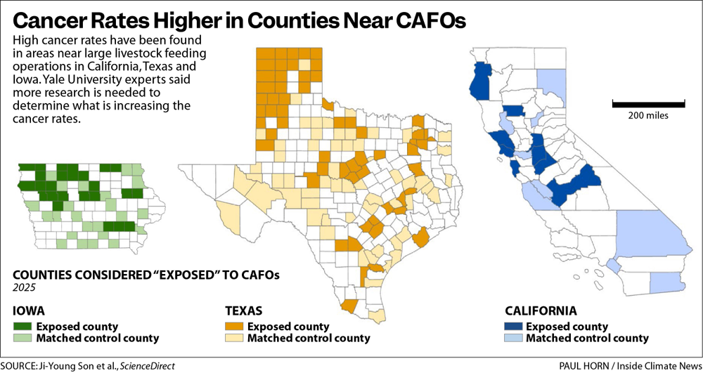Os investigadores que compararam mapas de CAFOs com dados de doenças a nível de condados da Califórnia, Texas e Iowa descobriram taxas aumentadas de todos os tipos de cancro, mas disseram que são necessárias mais pesquisas para determinar a causa.