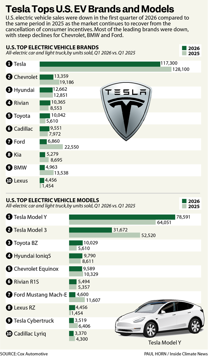 Isto ajuda a explicar porque é que as vendas de veículos eléctricos nos EUA caíram 27% no primeiro trimestre em comparação com o primeiro trimestre do ano anterior, de acordo com a Cox Automotive. A participação de mercado de veículos elétricos foi de 5,8% dos carros e caminhões leves dos EUA, abaixo do pico de 10,6% no ano passado.