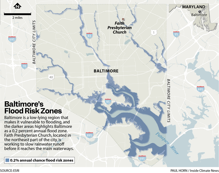 Baltimore fica em uma região baixa que faz fronteira com a Baía de Chesapeake e outros afluentes, o que a torna particularmente vulnerável.